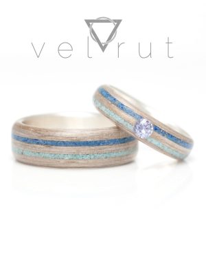 Gümüş astarlı, mavi fosfor katkılı lapis lazuli, yeşil fosfor katkılı turkuaz toz şerit ve açık mor renkli tektaşlı sarma ahşap yüzük.