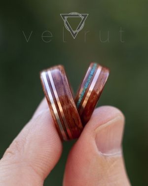 Kenarlı yarısı gümüş, yarısı yeşil turkuaz tozu ve bakır şeritli sarma ahşap yüzük.