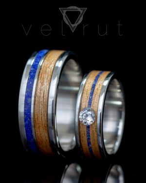 Paslanmaz çelik çerçeveli, Lapis Lazuli şeritli ve tektaşlı sarma ahşap yüzük.