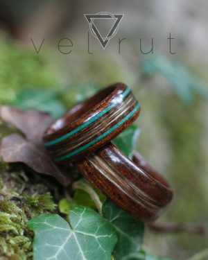 Akçaağaç tabanlı saç tutam şeritli ve çift malahit toz şeritli sarma ahşap yüzük.