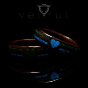 Malahit tozu ve fosfor katkılı lapis tozlu çift kesik şerit, tektaşlı ve fosfor katkılı lapis tozlu kalp işlemeli sarma ahşap yüzük.